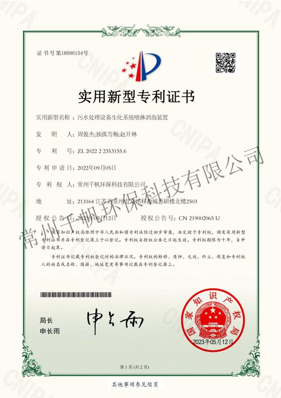 實用新型專利證書 污水處理設備生化系統(tǒng)噴淋消泡裝置